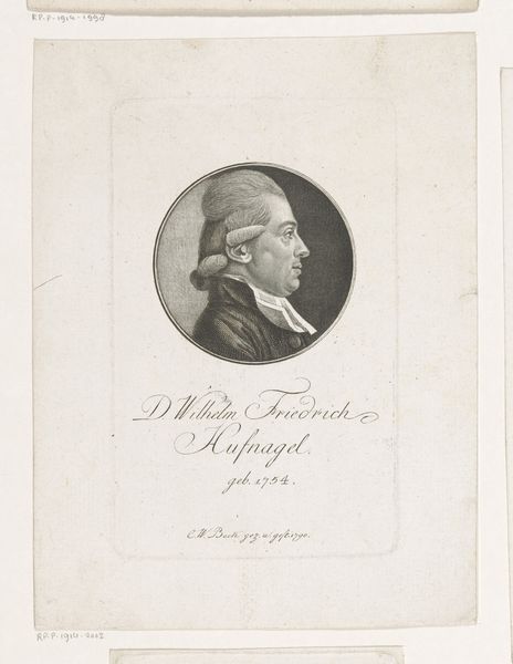 Christoph-Wilhelm Bock created this portrait of Paul Joachim Siegmund Vogel. The portrait presents a study in contrasts, encapsulated within the severe geometry of a circle. The subject's profile, rendered with meticulous detail, is stark against the muted backdrop, creating a play of depth and dimension. The artist skillfully employs hatching and cross-hatching to model the contours of Vogel's face and clothing. This meticulous attention to form and structure, along with the portrait's placement within a sharply defined circle, is a direct engagement with Enlightenment ideals of order and reason. This formal choice speaks to the period’s broader intellectual currents, which sought to codify and categorize knowledge. The portrait, therefore, is not merely a representation of an individual but an embodiment of the era's philosophical underpinnings. It uses the conventions of portraiture to declare broader truths about the sitter’s place in the world.