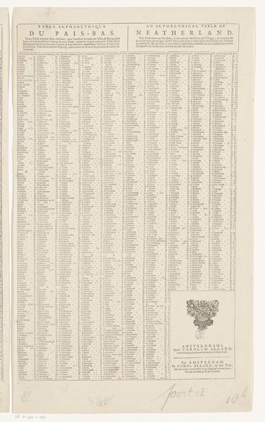 Editor: This is "Plaatsregister van alle dorpen en steden te vinden op de bijbehorende kaart (linkerblad)" by Frederik de Wit, dating from between 1666 and 1710. It's an engraving, essentially a very detailed list. It seems so… utilitarian. How can we consider something like this through the lens of art? Curator: This "utilitarian" list speaks volumes about the society that produced it. Consider the labour involved in its creation: the engraver meticulously carving each letter, the papermaker crafting the material support. It reveals a societal need for organization and control over geographical space. Editor: Control? Curator: Yes. Cartography in the 17th century was deeply intertwined with trade, navigation, and colonial expansion. This isn't just a list of towns; it’s a tool for managing resources, projecting power. Where did De Wit source his materials – the paper, the ink, the metal plate? How accessible was this kind of information to the general populace? Who was meant to use it? These questions highlight the relationship between artistic production and the broader economic and political structures. Editor: So, you're saying its artistic value comes from understanding how it was made, what it was made of, and who it was for, and why? Rather than some aesthetic quality? Curator: Precisely. This piece blurs the lines between art, craft, and commodity. It forces us to examine the conditions of its production and consumption and reconsider where we draw those boundaries in the first place. Editor: That's fascinating, I never would have thought of that by looking at just a list of towns and villages. Curator: Indeed, seeing it this way reveals so much about the means by which society operates. Editor: Well, I’ll definitely be looking at things differently now. Thanks for opening my eyes!