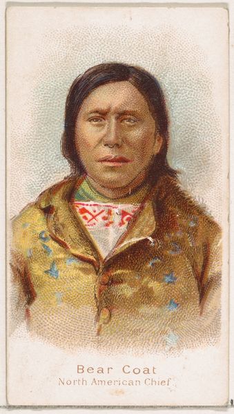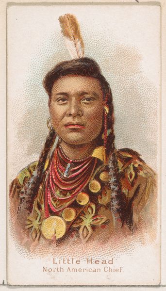 Editor: This is a portrait of Sitting Bull, a North American Chief. It’s a print made around 1888 by Wm. S. Kimball & Co. from their Savage and Semi-Barbarous Chiefs and Rulers series. There's such an interesting tension to the image – a clear attempt to document, but with a title that feels… loaded. What jumps out at you? Curator: The title "Savage and Semi-Barbarous" immediately reveals the skewed cultural lens through which Sitting Bull, and indeed all Indigenous peoples, were viewed. The feather, of course, speaks of leadership and spiritual connection, but note how it's presented almost as a curiosity. What do you make of his gaze? Editor: He looks... serious, maybe a little sad? His expression seems at odds with that title, which wants to paint him as something fearsome. Curator: Precisely. It is a clash of intended meaning and perhaps, the unintentional revelation of the subject’s dignity. Consider how the Western imagination used images like this to perpetuate narratives of conquest and dominance, subtly associating indigenous people with ideas of lawlessness and untamed wilderness. Does his clothing reveal anything about his status? Editor: His garments appear richly decorated, suggesting a man of importance. That circular medallion seems particularly significant, catching the light in a way that draws the eye. Curator: Yes. Symbols become incredibly powerful precisely because they carry so much unspoken cultural information. What feelings does the image provoke? Editor: It makes me think about the complex and often contradictory ways cultures understand each other. This print tries to define Sitting Bull, but ultimately, it only tells us more about the biases of the time. Curator: And that is the lasting power of images – to unintentionally reflect not just the subject, but the perspective of the creator, inviting future audiences to decode layers of meaning beyond the surface. Editor: It really brings home how important it is to consider the context and intention behind the imagery we encounter. Thank you.