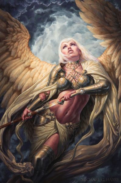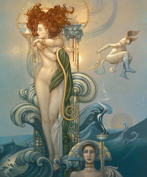 Michael Hayes produced this image, entitled "Aesthyr," sometime in the late 20th century. The artist’s depiction of a regal woman standing before a carved stone immediately conjures up imagery of ancient goddesses. Looking closely, we see the artist make use of visual codes and cultural references to create meaning. The woman's feathery garments and jewelry, along with the Celtic knotwork on the stone behind her, create a fantasy image that draws upon neo-pagan spirituality and the historical idea of the noble savage. It also evokes the more recent cultural phenomenon of New Age spirituality, which embraces a variety of traditions. While this image might seem timeless, it speaks to our own contemporary culture. We can delve deeper into this by studying trends in contemporary art and spirituality. The meaning of art is contingent on its social and institutional context.