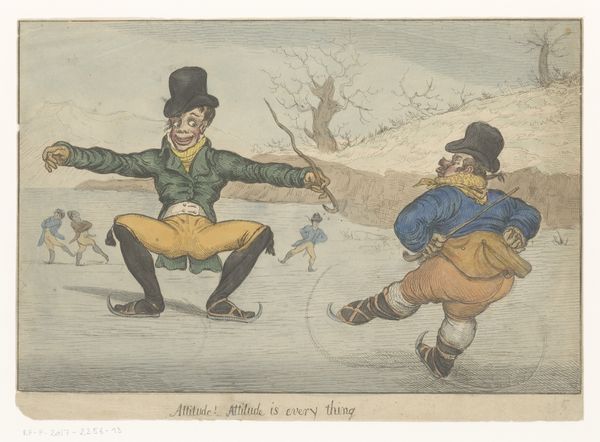"The Elements of Skating: Attitude is Everything" was etched by James Gillray, a prominent British caricaturist, around 1810. Gillray, working during a time of intense political and social change, often used his art to satirize the elites. Here, we see two figures on a frozen pond, their exaggerated postures and expressions ripe for comedic interpretation. The corpulent figure to the left, possibly a jab at the upper class, contrasts sharply with the other figure, who seems to defy gravity. This juxtaposition of physical prowess and awkwardness challenges the conventional representations of class and masculinity. Gillray's prints were widely circulated and consumed, shaping public opinion and contributing to the formation of national identity. But beyond the political commentary, I find this work emotionally resonant in its playful exploration of the human condition. Gillray offers us a glimpse into a world where laughter and social critique intertwine, reminding us that even in the face of absurdity, there is room for resilience and resistance.