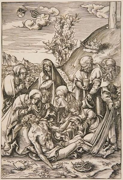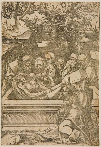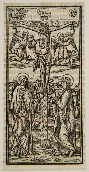 Curator: This unsigned print, known as "Holy Family," presents an intriguing case for understanding devotional art outside the established master narratives. Editor: There's a starkness to it, isn't there? The lines are so defined, creating this dramatic sense of light and shadow, almost like a stage setting. Curator: Precisely. It's fascinating to consider the labor involved in creating this work – the process of carving the woodblock, the social function of distributing religious imagery to a wider audience, and the consumption and commodification of these images. Editor: And how the composition centers the figures. The halos, so clearly delineated, define the sacred space inhabited by the Holy Family, drawing our eye into their serene expressions and graceful poses. Curator: These prints offered access to religious iconography for those who could not afford paintings; this artwork brings forth questions about the role of art within social strata. Editor: The medium itself, the print, has a graphic quality that emphasizes form and line over color and texture, making it a particularly powerful symbol of the holy. Curator: Right. Considering the historical context alongside the finished product provides a fuller understanding. Editor: Indeed. By focusing on its composition, we reveal a timeless rendering of faith.