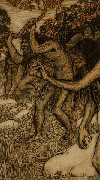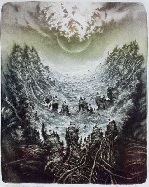 Alan Lee painted "The Trolls See the Dawn" using watercolor, a medium known for its delicacy, luminosity, and potential for blending. The artist coaxes us into a moment of reckoning as the light touches the trolls’ skin. Lee's mastery of watercolor brings a palpable sense of dread. We see the transformation as the troll's figures slowly turn to stone. The painting seems to capture a fleeting moment, where the solid and the ethereal meet. Watercolor demands a thoughtful approach, where the artist must surrender to a certain extent of control. Each wash of pigment interacts with the paper, creating subtle textures and atmospheric effects. The fluidity of the medium mirrors the vulnerability of the trolls. Lee invites us to consider the relationship between materials, process, and narrative, blurring the lines between craft and fine art.