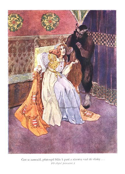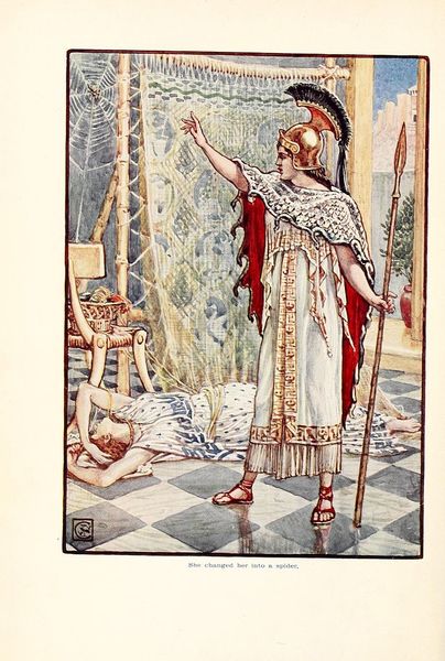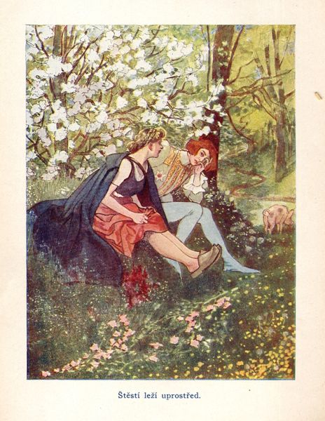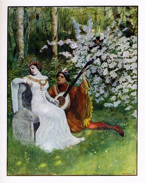 Editor: This is Artuš Scheiner's "Illustration for Božena Němcová's Fairy Tales", and while it lacks a precise date, it's done in watercolour. I find the overall scene quite dreamlike, with a princess adorning herself in finery by a spring. How do you interpret this work? Curator: I see this piece as more than just an illustration. The positioning of the female figure, surrounded by the natural world, prompts us to consider the intersection of gender, identity, and the environment within the narratives of fairy tales. Considering Božena Němcová was a significant figure in the Czech national revival, known for her advocacy for social justice and female empowerment, how does Scheiner's image either reinforce or challenge societal expectations of women at the time? Editor: That’s a good point about Němcová and national identity. The princess is beautifully adorned, suggesting wealth, yet she’s alone in a seemingly wild space. Does that speak to the complex role of women in national narratives? Curator: Precisely! Are we looking at a woman who embodies national ideals of beauty and purity, or one who is isolated and constrained by them? Consider also the absence of a male figure. Where is the Prince Charming? Does this perhaps suggest female agency and self-determination, even within the seemingly restrictive genre of fairy tales? How does the surrounding landscape add to this sense of both freedom and constraint? Editor: It's definitely something to consider. Thanks, I hadn't thought about the national and feminist layers so directly. Curator: Exactly! Fairy tales are never just simple stories; they reflect deep cultural anxieties and aspirations related to identity, gender, and power. Engaging with that, especially with consideration for intersectionality and critical theory, will deepen one's appreciation of even something that appears to be merely illustration.