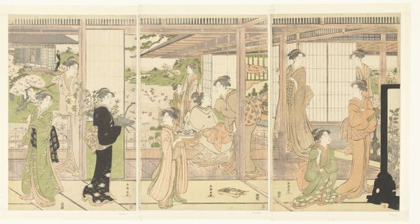 This woodblock print triptych, "Beauties on a Veranda among Cherry Blossoms from which a Samurai is Departing," was made by Utagawa Toyokuni I in Japan. The artwork is composed of three panels of paper, each carefully carved with an array of figures, architecture, and blossoming trees. Woodblock printing is a labor-intensive process, demanding precision and skill. First, the artist creates a design. This is then transferred to a block of wood. The printer carves away the areas that should remain blank, leaving the design in relief. Ink is applied to the block, and paper laid on top. Through careful pressure, the image is transferred. Each color requires a separate block. The flat, graphic quality achieved through this technique gives the artwork a distinctive aesthetic. The delicate lines, the subtle gradations of color, and the intricate details are all testaments to the craft involved. The printmaking process is essential to understanding the social context of the work, and the economics of its production. By considering the materials, making, and social context, we can move beyond aesthetic appreciation and gain a more profound understanding of the artwork's full meaning.