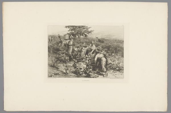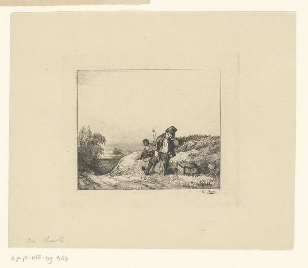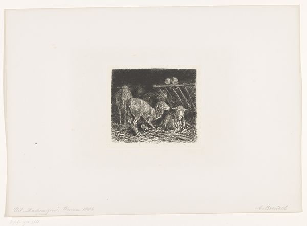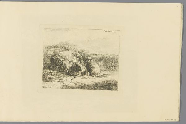 Curator: Here we have Louis Robbe's "Goat, Two Sheep, and a Lamb in a Meadow," an etching that the Rijksmuseum dates roughly to between 1816 and 1879. It's a scene of pastoral simplicity. What strikes you first about it? Editor: There's a quietness to it, isn’t there? The almost monochrome palette, the way the animals are arranged… It evokes a sense of calm. Technically, the variations in hatching and line weight are remarkably well-executed to produce tonal depth and texture. Curator: Indeed. And consider the social context of such idyllic scenes during that era. As industrialization spread, depictions of rural life often served as a comforting counterpoint, an idealized escape from the realities of urban poverty and class divisions. It subtly reinforces a specific vision of pastoral life. Editor: I can see that. It's also a very well-balanced composition. The goat, grazing on the left, mirrors the resting sheep and lamb on the right, creating a visual harmony, anchored in that shared mid-ground. It really guides the eye across the landscape. Curator: I would argue that these artistic choices were politically significant. By representing the countryside in this tranquil manner, Robbe subtly endorses prevailing social structures, even unintentionally. What’s unsaid in art speaks loudly. Editor: Fair enough, the absence of social commentary does make a statement. Still, the masterful way the artist uses light and shadow, especially to define the wooly textures, gives this an undeniable tactile presence. Curator: This piece prompts consideration for the relationship between art, labor, and land ownership during a period of massive upheaval and disenfranchisement. And where farm workers are within these pictures... or not. Editor: True, there are many perspectives one could take. At a technical level, I can only marvel at Robbe's effective representation of light and texture. Curator: I concur! Thanks for your considerations. Editor: My pleasure. It's been an insightful chat.