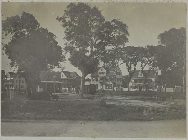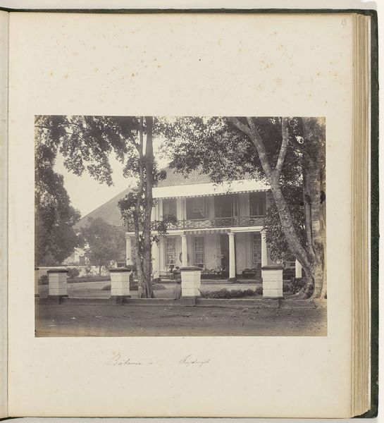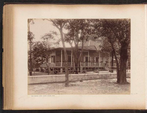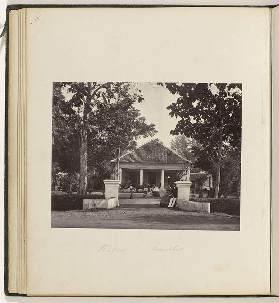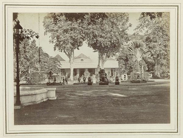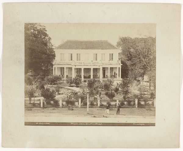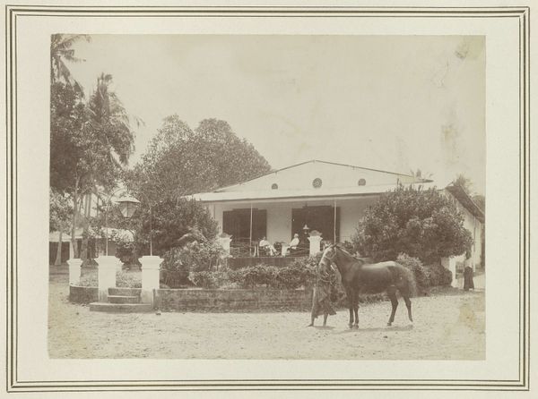 Curator: Ah, I am struck by the serenity, the stillness... almost like time is holding its breath in this photographic print. It exudes quiet contemplation. Editor: Indeed. This gelatin silver print, "Woonhuis met tuin," by Kassian Céphas, created around 1886, offers a fascinating study in composition. Note the clear lines of perspective directing our gaze towards the central structure, the house itself. The use of light and shadow also subtly segments the photographic space. Curator: That house though... doesn't it almost seem like a stage set? Those tiny figures posed on the porch…they’re so rigid. It makes you wonder about the realities obscured beneath that veneer of bourgeois order, doesn't it? Like everyone's playing dress-up. Editor: Certainly. One could interpret the structured garden and symmetrical façade as symbolic of social control. Note how the very subdued colour palette adds to this controlled atmosphere, suggesting, perhaps, the photographer’s subtle critique of colonial order in the Dutch East Indies. Curator: Mmm, or perhaps it's more melancholy, seeing the transience, capturing a moment. Photographs attempt to stop time, but here you really feel time eroding the original intent and mood. Editor: It could be argued, though, that photography intrinsically lends itself to freezing time, thus enabling posterity, yet the artistry lies precisely in layering emotional depth into its objective frame, transforming mundane realism into enduring symbolist metaphor. Curator: Alright. Alright. Now I'm wondering about the unseen inhabitants... their lives unfolding within those walls as a photographer points and snatches away a piece. And forever binds the souls inside with their new image! Editor: Indeed, it's those unspoken stories within and between spaces— between foreground and structure — that amplify and intensify the artistic value that makes a work memorable. Curator: Well put! I still sense that stillness I mentioned...it invites deeper reflections. It’s like Céphas froze more than just the scene... he’s immortalised an intangible, emotional state of mind. Editor: Precisely; that is exactly the synthesis that ensures the success of an artistic enterprise in whatever material or time: merging both intellect and feeling.