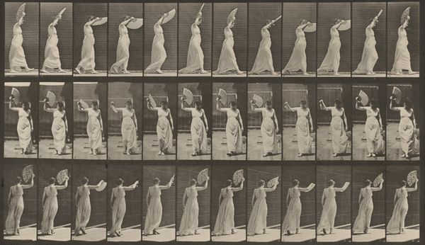 Curator: Immediately, it strikes me as a ghostly dance. These repeated figures...are they fading or emerging? Editor: I understand that impulse! What we are looking at is Eadweard Muybridge's "Plate Number 199. Curtesying, a fan in right hand" from 1887, a gelatin-silver print study of human locomotion. Curator: Locomotion. Such an understated title for what feels like a ballet of transience. A woman frozen, yet flowing. Look at the fan—almost vibrating with captured movement! Editor: Right! Each frame meticulously captures a stage of the curtsy, almost as if to deconstruct and examine the building blocks of a polite gesture, to strip off of its mystery. It almost reminds of medical study, something dehumanizing but deeply interesting. Curator: Yes, like examining the gears of a social mechanism! But to me, it evokes more than that. It touches upon the symbolism of ritual. The bow, the bend, it all suggests a dialogue with something greater, lost somewhere between intention and action. It all seems deeply coded with meaning! Editor: Fascinating perspective. And considering his other works studying people and animals in motion, do you see any ties there? Do the repeated human action link our idea of what animals feel like to ours? Curator: An interesting point! The cultural impulse to order, to analyze. To me, it represents something beyond mere taxonomy. The fan here is central to my analysis, as if its repetitive nature reveals a language beyond just utility! Is it only to provide air? Or to add mystique and hide expression? Is it perhaps the representation of the fleeting human essence? Editor: Well, there is only one way to find out. I guess it's time to start doing some curtseying in front of my bathroom mirror. But until then, this investigation of gesture has given me a lot to think about, especially what we carry when we perform. Curator: Absolutely, something so basic but at the same time full of nuances, mystery, history, and cultural expression, frozen and at our disposal. A lovely exploration, indeed.