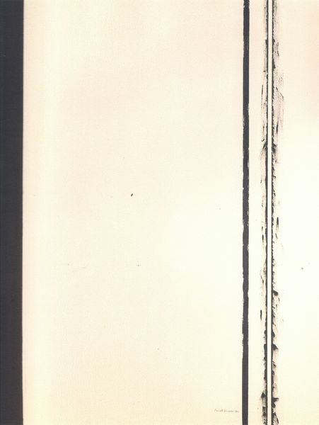 Editor: Here we have Barnett Newman’s "Fourth Station" from 1960. The contrast of the black and white is so striking and really pulls me in! What strikes you when you look at this piece? Curator: What grabs me is how the apparent simplicity masks a sophisticated engagement with the physical process of creation. Look closely at how Newman applied the paint. The subtle textures reveal the action, the labor inherent in producing this seemingly minimalist work. How does that materiality influence your perception of it? Editor: It makes me think about the artist's hand, which I wasn’t really considering at first glance. The line isn't just *there*; it’s made. Curator: Exactly. And within the context of 1960, consider the industrial processes beginning to dominate art production. Newman's emphasis on the handmade could be seen as a subtle act of resistance. Does knowing that change your appreciation? Editor: It does, actually. I initially saw it as very austere, but knowing there’s a conversation with industry makes it warmer, almost…human. Do you think he intended for us to see this tension? Curator: Intention is a tricky thing. What matters is how the work embodies that tension. The perceived perfection clashes with the messy reality of its making, and that invites us to reflect on labor, production, and the role of the artist in a rapidly changing world. The value, therefore, isn't solely aesthetic but embedded in the act and context of its making. Editor: That's a completely different way of approaching the work than I initially imagined. Thanks for pointing out the importance of its materiality and social context. Curator: My pleasure! It is amazing how one perspective changes our perceptions.