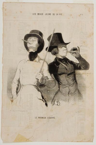 This lithograph, "Two Young Men With Their First Cigar," was created by Honoré Daumier, a French printmaker known for his social and political commentary. Here, Daumier used lithographic crayon and ink to depict two young men experiencing the pleasures of smoking for the first time. The lithographic process itself is crucial to understanding Daumier's work. A design is drawn on a stone with a greasy crayon, then treated with chemicals so that ink adheres only to the drawn areas. This allows for the relatively quick and cheap production of images that could be widely disseminated in newspapers and journals. The very accessibility of lithography allowed Daumier to reach a broad audience with his satirical observations about Parisian society. Cigars, like the suits worn by these young men, were potent symbols of bourgeois culture and expanding capitalism. Daumier used the material means of his art to critique the very society that made it possible.
