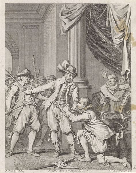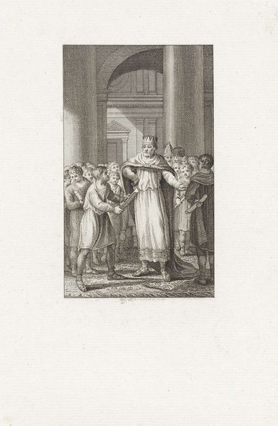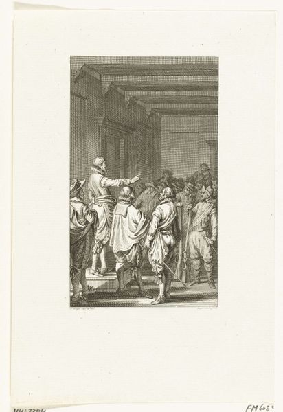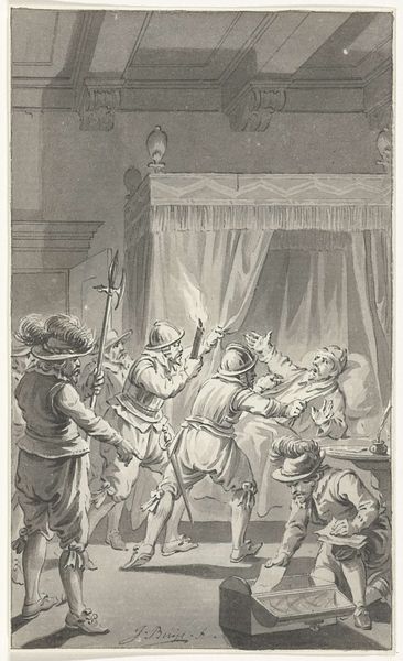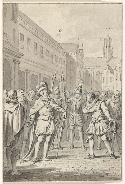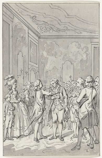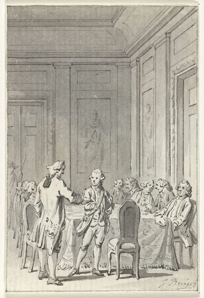 Curator: This drawing by Jacobus Buys, made between 1793 and 1795, depicts "Wigbold Ripperda addressing the citizens and militia of Haarlem, December 1572." Editor: The scene certainly carries weight. You can feel the tension radiating off those gathered. It looks to me like a stage – all very carefully presented for maximum impact. Curator: The artist utilizes the symbolic weight of leadership to portray a powerful moment. The raised hand, a universally understood symbol for directing attention, indicates Ripperda's command over his audience and the historical narrative at play. Notice how the light seems to almost shine on him as well? Editor: Absolutely, but it also brings out the qualities of the paper itself. You can really see the pen and ink's interaction with the page here. The textures seem so subtle; I'd love to know what kind of paper was used. This was a preliminary work, and to see those decisions laid bare, that materiality is exciting! The lines create the value! Curator: In that moment, Ripperda embodied defiance and resistance. These ideas continue to be potent motivators in the realm of visual rhetoric. His clothing is carefully detailed too - do you feel how it contributes to the creation of authority here? Editor: No doubt, the clothing marks class, but I see other class tensions. These guys seem so overdressed for this interior space. This wasn't off-the-cuff; there's staging involved here. Curator: Perhaps Buys hoped to inspire feelings of civic virtue, given that he was making this around the time of other revolutions. This image, therefore, echoes earlier ideals in a potent mix of historical reenactment. Editor: True. And consider the practical aspect. Ink and pen were comparatively accessible artistic materials, perfect for circulating such revolutionary ideas through prints. It brings the heroic moment down to Earth. Curator: In thinking about historical reenactment and civic virtue I realize there are multiple avenues to explore the ideas being made. Editor: Agreed, whether its paper source or historical sources both seem relevant in viewing this.