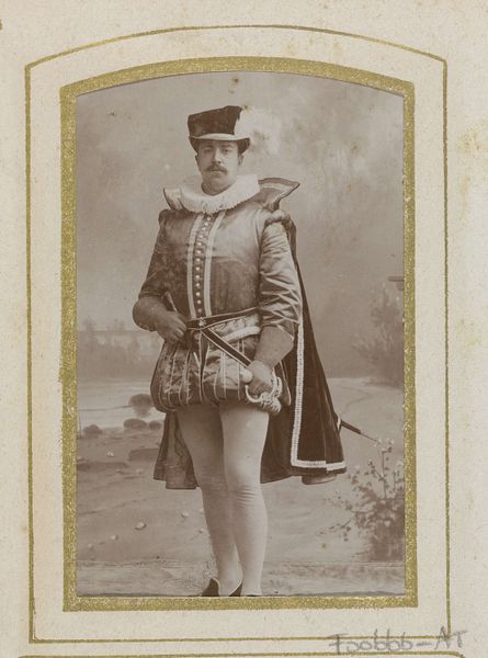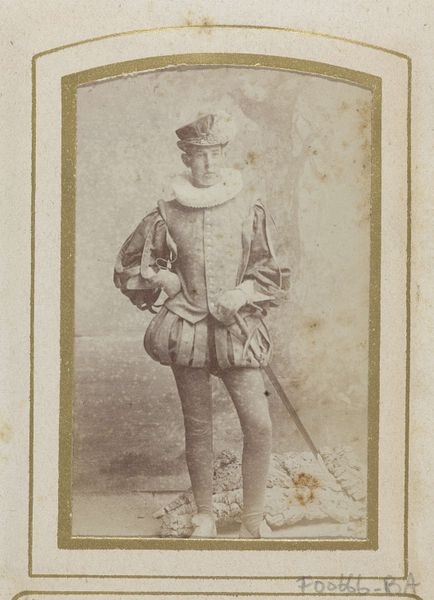 Curator: This fascinating photograph, taken sometime between 1860 and 1905, is titled "Portret van een jonge man in kostuum met degen, aangeduid als J. Bake"—or, in English, "Portrait of a young man in costume with a sword, identified as J. Bake". Editor: It strikes me immediately as something theatrical. The pose, the costume... a touch melancholic, too, perhaps. Curator: Absolutely. He’s styled in what appears to be 17th-century garb—note the puffed sleeves, the wide ruff, the feathered hat. Photography at this time was becoming more accessible, but staging these elaborate scenes indicated a level of societal presentation and image construction. It says something about identity. Editor: Right, a deliberate performance for the camera. What interests me is this assumed identity of "J. Bake". This isn't a simple record; it feels more like creating a cultural memory. Why this particular costume? What does this chosen persona reveal or conceal about his actual self, within the social confines of the time? Curator: Costumes throughout history have been ways of appropriating cultural meaning. Is he playing a role? What does it mean? Perhaps he's drawn to an era perceived as more romantic, more heroic? The sword, in particular, lends itself to archetypes of power, or maybe just playing the role. Editor: I can see the influence of historical genre paintings here—very much in line with the taste for dramatized history that was popular then. Museums themselves became stages for understanding these moments of greatness. The way he stands there, with the slightly faded background— it’s like looking into another time through an institutional lens. Curator: It does highlight the evolving function of portraiture—not just about likeness but about aspiration. This print becomes a vessel for something more profound— dreams, self-fashioning, maybe even escape. It reminds us of the stories we project onto images, and vice-versa. Editor: Exactly. And how those stories continue to resonate, shift, and morph as they're viewed across generations. Fascinating to consider all that's present here, within such a quiet photograph.