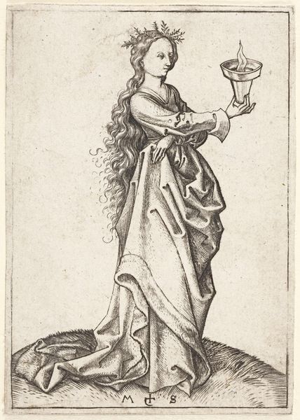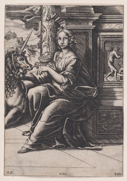 Francesco Rosselli created this engraving of The Cumean Sibyl in Florence during the late 15th century. The Sibyls were prophetesses in the ancient world, who were often depicted in Renaissance art as figures of wisdom and foresight. Rosselli’s engraving emerges from a specific cultural context where classical mythology was being reinterpreted through a Christian lens. The Sibyls were often seen as precursors to the coming of Christ, bridging the pagan and Christian worlds. This engraving participates in a tradition of representing female figures as bearers of knowledge and prophecy, yet these representations are often mediated through male artists, shaping how female wisdom is perceived. Consider the emotional weight carried by the Sibyl, poised between worlds, burdened with knowledge of the future. She embodies a complex interplay of power and vulnerability, knowledge and fate. How does her image resonate with contemporary ideas about female agency and the burdens of knowing?