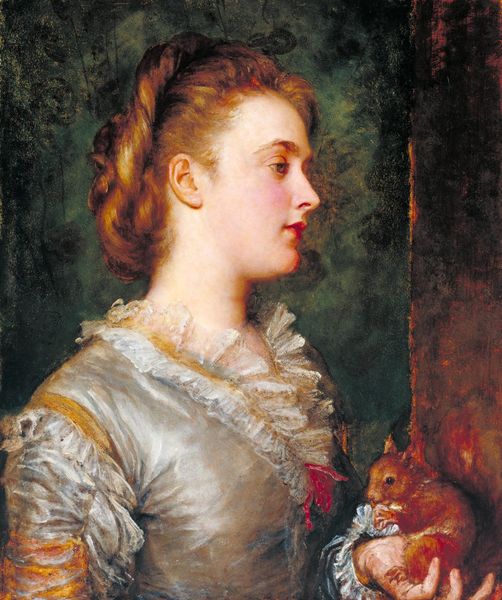 Curator: Let’s turn our attention to John Singer Sargent’s 1890 oil painting, "Florence Addicks". The portrait features a young woman, her gaze averted, adorned in an elaborate gown. Editor: The first thing that strikes me is the materiality of that gown. You can almost feel the silk ribbon’s weight, its sheen suggesting expensive origins—the portrait functions as soft advertisement for luxury. Curator: There's a deliberate softness to it all. It’s almost like Sargent wants to paint a memory. Do you notice how the yellow sash melts into her sleeve? The yellow flows throughout, suggesting a unified personality, reflecting off her skin. I almost want to feel the fabric; you’re right, there is something sensual in how real that satin looks. Editor: Consider what this meant for someone like Addicks to commission and be immortalized with such lavish expenditure. We get to ponder who made those things, at what cost, what sort of labor produced these luxurious items, and for whose benefit, really. How much invisible toil to make one moment shimmer? Curator: An interesting perspective! I think Sargent attempts to express something else about her. It seems he is really interested in revealing a little truth in her eyes; or better, showing that mystery that underlies youth. The very fluid brushwork gives a feeling for the intangible—that she is not fully here, that she may disappear or grow right out of her painting and form a butterfly. The impermanence, perhaps, of beauty and youth itself. Editor: Absolutely! And I cannot dismiss what is at stake when we consider what such artistic mastery entails: access, money, and material stability to engage with high-art culture. She must have really believed that getting Sargent was the key. Curator: Yes, she chose the right crafter for her goal! Sargent had that certain something in capturing beauty... perhaps a bit like alchemy? The right hand transforms something into what shines. It really gives insight on those gilded times. Thank you! Editor: Agreed. The dialogue between brush and raw stuff remains fascinating and revealing of her status and expectations. Thank you.
