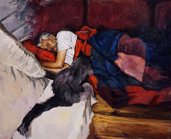 Curator: This painting by Salman Toor, created in 2019, is titled "Puppy Play Date." It's an oil on canvas piece rendered in a style reminiscent of genre painting. What strikes you most when you look at it? Editor: The light, it's strange and enchanting! A gentle luminescence around their heads—like a halo, but subtle. And the almost feverish energy of the dogs amidst all the softness. It creates a tender but unsettling vibe, like a memory. Curator: The materials themselves, especially the oil paint, contribute heavily to that sense of memory. Look at the texture, the way the brushstrokes build up layers of meaning. The green of the chair, almost violently green against the softer hues, grabs your attention. And those layers upon layers of paint suggest a weightiness—perhaps a commentary on the weight of relationships and domestic life? Editor: Or maybe just the pleasure of layering and seeing where the paint wants to go! Those pups though. Are they real or some weird hallucination? They look like two dogs kinda smashed together to me; beautiful but totally surreal. Curator: It definitely toes the line between observation and something more internal, a fantasy maybe. I'm interested in how Toor uses portraiture and figurative painting to comment on contemporary social dynamics, and what seems like quiet domesticity serves as a staging ground for exploring these deeper societal tensions, queer intimacy. Editor: Totally get that. And the room—it feels familiar and generic, not specifically placed in the world. That laptop could be anywhere! Everything feels like its been filtered through a sentimental lens, doesn’t it? Like a queer memory bubble. Curator: Precisely! And this use of oil paint situates it in this tradition of painting... making that memory a tactile thing, a record. And records can be reassessed, reinterpreted... Editor: Exactly! Its funny how simple things, dogs playing in our laps can be, like tiny portals that way.