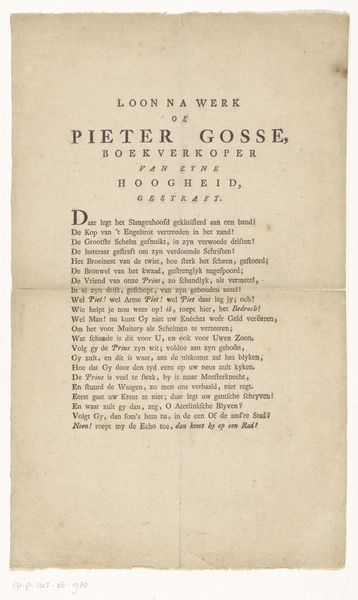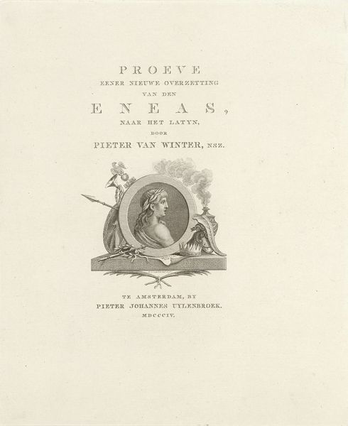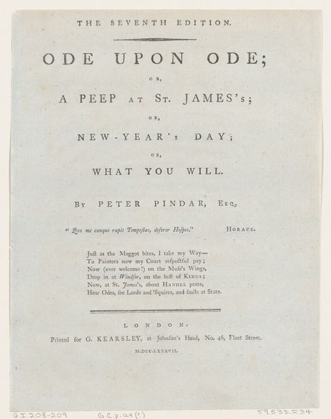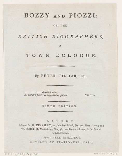 Editor: Here we have the frontispiece from "Peter's Prophecy, or The President and Poet" by Peter Pindar, published between 1786 and 1792. It’s an etching with typography, and it strikes me as quite austere, almost purely informational in its layout. What visual elements do you find most significant? Curator: The overall composition, of course. Observe the rigid hierarchy established by the varied typefaces. The title commands immediate attention with its large, bold lettering. Each line adheres to a strict centering, reinforcing the sense of order and rational design characteristic of Neoclassicism. Notice the considered use of empty space, carefully balanced to separate textual blocks. Editor: Yes, it seems every aspect, from the font choices to the leading, has been meticulously planned. Curator: Indeed. Typography takes on a form beyond mere utility; it is a deliberate aesthetic choice. It contributes significantly to the artwork's visual structure, its message. Do you find the composition dynamic or static? Editor: It definitely feels static. Is that sense of stillness a purposeful reflection of the subject matter or period? Curator: Precisely. The static quality mirrors the values often associated with institutions of that era: stability, tradition, and reasoned discourse. How does the etching beneath the title factor in? Editor: Well, honestly, I don’t really see it. My eye is drawn so much to the typography that the etching almost fades into the background. I wonder if it could have been a little less subtle? Curator: Interesting point! One could argue its subtlety compels closer inspection. Perhaps its role is not to dominate, but to provide a visual counterpoint to the textual framework. Editor: So, the text and etching aren't fighting for attention. It all adds up! I’ll definitely pay more attention to typography in prints going forward!