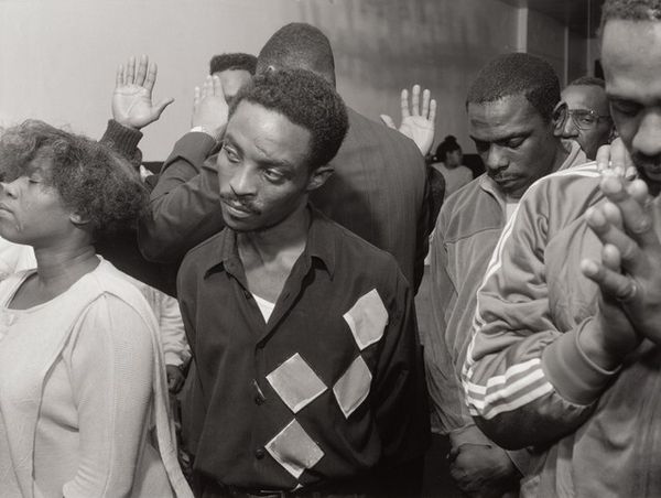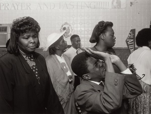 Editor: This photograph, simply titled "Untitled" and dated 1992, is by Thomas Roma. It looks like a gelatin-silver print, capturing a gathering of people in what seems to be a moment of prayer or reverence. What really strikes me is the mix of the everyday, like the UCLA t-shirt, with the deeply spiritual atmosphere. What do you see in this piece? Curator: Well, that juxtaposition you pointed out is key. I see layers of meaning embedded in this image. Roma’s work often captures moments of intense emotion within very specific social contexts. Notice how the black and white lends a timeless quality, almost like a visual echo of historical photographs depicting faith and community. But the contemporary clothing, that UCLA shirt you mentioned, anchors it firmly in its time, creating a dialogue between past and present. Editor: So, that tension is deliberate? Curator: I believe so. Consider the clasped hands, a universal symbol of prayer. But in what kind of space are they clasped? How does that change the reading? Does that shirt introduce ideas of class? Ambition? Access to education? The choice of attire subtly introduces cultural narratives into the space of worship, challenging any simple, singular understanding of faith. The arrangement creates a new iconographic reality for those figures present in that space. Editor: That's a compelling idea. So the photograph itself becomes a kind of symbol… or a cultural record? Curator: Exactly. Roma isn't just documenting; he is layering symbols, creating a visual text rich with cultural information, ready for the viewer to interpret and reinterpret based on their own experiences and understanding. What emotional impact does it have on you as you view this photograph? Editor: It makes me think about how identity and faith intersect and interact in everyday life and how that has changed over time. I now understand that "Untitled" suggests a myriad of potential meanings! Curator: Precisely, and in that interpretive freedom is a great opportunity.