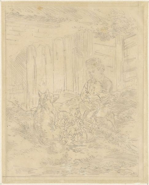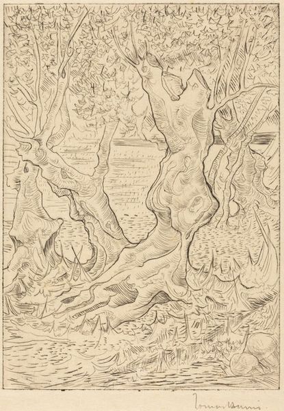 Editor: This is Eugène Delacroix's drawing, "Jacob Struggling with the Angel." The figures seem locked in a dynamic embrace. What do you see in the composition? Curator: Note the cyclical construction, a dance of opposing forces. The angel and Jacob’s forms intertwine, their limbs creating a spiraling energy, offset by the static, grounding tree. Editor: I see what you mean, there's a tension between the active figures and the passive background. Curator: The medium itself, pencil on paper, allows for a delicacy in rendering form and texture. Light and shadow delineate the contours of the figures, emphasizing their muscularity. Editor: It’s interesting how the form communicates the struggle, the tension. Curator: Indeed. The composition and technique work together to convey the psychological and physical struggle at the heart of the biblical narrative. Editor: I hadn't considered the role of the medium itself so explicitly. Thanks for your perspective.