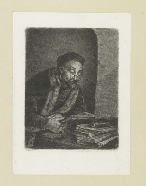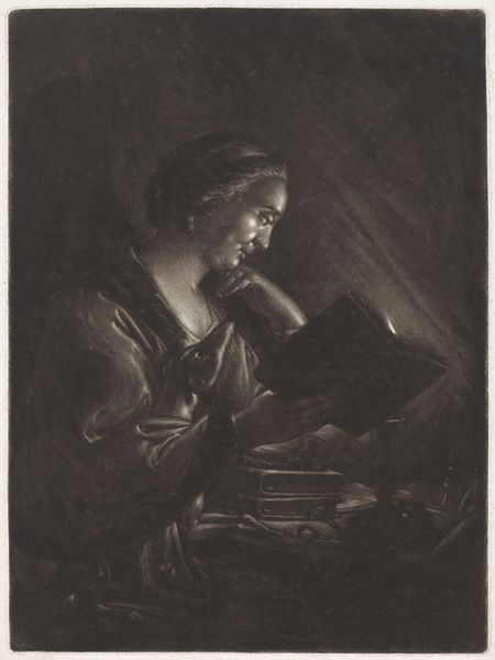 Curator: This is "Lezende vrouw" by Aert Schouman, likely created sometime between 1720 and 1792. The artwork, currently residing here at the Rijksmuseum, presents us with a quiet scene rendered in pencil on toned paper. What strikes you initially? Editor: There’s an undeniable weight in this image, a sombre intensity. The chiaroscuro effect immediately draws the eye to the subject's face and hands, but then you're plunged into this enveloping darkness. It feels like witnessing a very private, perhaps even a melancholy, moment. Curator: Precisely. Schouman’s delicate pencil work uses shading to create this mood, which reminds us that older women faced unique societal challenges in that era—diminished social status, economic insecurity, reliance on family, their identity. Editor: Her glasses! They really stand out. It emphasizes intellect, literacy but, perhaps, also a certain frailty or reliance on visual aids in aging. Are they a symbol of something more than just sight correction? Curator: Well, eyewear gained traction as a symbol of learnedness during this period. Beyond practical use, eyeglasses and books in art reinforced access to knowledge, a privileged pursuit limited by gender. A woman engaged with texts signaled a move against traditional, restrictive gender roles. Editor: Absolutely, a powerful statement on female education. Then, there's the covering—the veil, headscarf. I am immediately considering what messages of privacy, or, perhaps, religion the artist conveys by having her covered in this manner? What’s the relationship between inner wisdom and outward presentation? Curator: Contextualizing veiling is critical, recognizing the myriad cultural, religious, and socioeconomic associations of such practices during the Dutch Golden Age, alongside later colonial expansions which used similar symbols to justify cultural hegemony. Was it cultural or perhaps related to aging within society at this time? Editor: It provokes a much broader contemplation on how artists then—and how we still—visualize knowledge, and how the human gaze processes and understands those visuals. Curator: Absolutely. The piece makes visible not only a woman reading, but also larger questions of literacy, identity, and agency during this time. Editor: The nuances of shadows, the subject's face…I see the work asking vital questions on seeing itself.