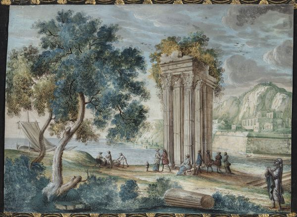 Schröder created 'Landscape with Beach, a Temple Ruin in the Foreground' using gouache on parchment. The artwork transports us to a classical scene, rendered with the delicate touch characteristic of the 18th century. Painted during the height of the Enlightenment, a period defined by reason and order, landscape painting served as a way to illustrate idealized visions. Schröder, working during this time, engages with the prevailing aesthetic. Note the figures populating the landscape; their postures and clothing tell a silent story. Perhaps they are participants in a staged performance, a reflection of the theatricality and display of power prevalent in aristocratic society? The crumbling temple, juxtaposed with vibrant nature, suggests a reflection on time, ruin, and the transience of human achievement. Schröder seems to ask us to contemplate not just the beauty of the scene, but also the narratives and histories embedded within. What stories do we project onto such idealized landscapes?