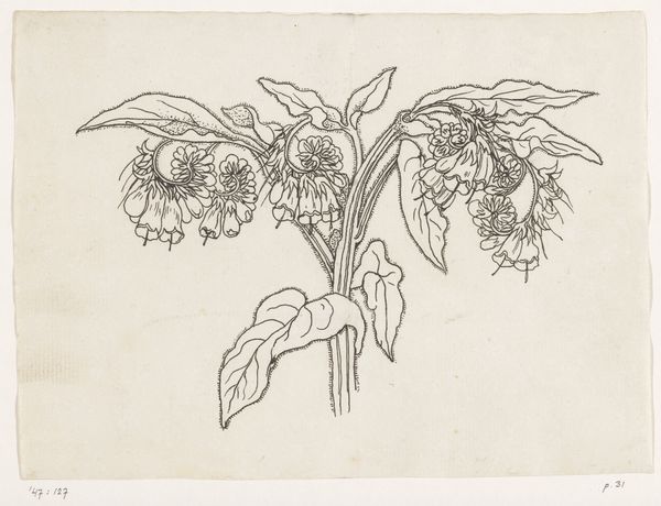 Editor: Richard Nicolaüs Roland Holst’s "Sunflowers," created in 1892, presents a captivating pencil drawing, seemingly simple, yet possessing a haunting quality. The sunflower heads droop, conveying a sense of melancholy and the transient nature of beauty. What do you see in this piece? Curator: It's crucial to acknowledge how these "Sunflowers," though seemingly a benign still life, might reflect the sociopolitical atmosphere of the late 19th century. Consider the symbolism embedded within the motif of wilting flowers. Is Holst commenting, perhaps unconsciously, on the fading societal structures or the decline of certain power dynamics of his time? The very act of choosing sunflowers, plants that boldly face the sun, only to depict them in decline, introduces a tension ripe for interpretation. Editor: That's interesting. I hadn’t thought of the wilting as anything more than a botanical stage of life, rather than a reflection of society at large. Curator: Precisely. It's about challenging the assumption that art exists in a vacuum. What does it mean to create an image of nature failing to thrive during a period of industrial growth and perhaps also considering shifts in cultural hegemonies in Dutch society? The medium, pencil, lends itself to a certain quiet intimacy, further complicating the narrative. Editor: So, are you saying Holst's choice to depict wilting sunflowers connects with the industrial changes happening? How can a drawing do that? Curator: It isn't a direct depiction, of course. But think of the Romantic movement's rejection of industrialization. This piece, made a little later, seems to echo those sentiments by pointing to a potential decay through something like dying sunflowers. Consider the work as participating in an ongoing discourse about the costs of progress and our relationship to the natural world. The fragility rendered in pencil becomes a statement in itself. Editor: I see. Thank you. It really encourages me to look at art through a wider lens, beyond just aesthetics. Curator: Absolutely. And questioning the artist's intention, even if speculative, allows for a more nuanced engagement with the work, broadening our understanding of its place in history.