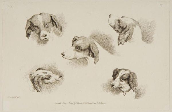 Curator: "A Motley Crew" is a captivating watercolor by Carl Reichert. He's chosen a playful title to match this assortment of canine characters. Editor: What strikes me immediately is how isolated each dog seems. The artist has given us these portraits, but it almost feels like an inventory. What's your read? Curator: Each portrait contains compelling, varied visual components. Note the differing directions that each animal is facing, from the downward gaze of the pug to the attentive stare of the dog on the upper register. It brings about an overall balance. Editor: While it’s undeniably skilled in its rendering, there's something unsettling about grouping them this way. I wonder what the purpose might be behind this depiction. Were these breeds considered especially prized or collected back when Reichert created this work? What's being said here about class or taste? Curator: The interplay of light and shadow brings a vibrancy to their coats, rendering their textures exquisitely. See the fine detail with which Reichert has applied paint across the Dachshund. Notice that tonal gradations mark both dogs' coats as almost entirely different species of canine. Editor: Yes, but is it merely a celebration of their physical attributes or does it serve a deeper, perhaps even inadvertently political purpose? Think about the role dogs have played throughout history as status symbols, tools of empire, or even symbols of exclusion. By grouping them, Reichert isn't just presenting specimens; he's highlighting hierarchies, visible characteristics, even ideals of canine identity. Curator: The formal qualities alone offer us access to a wealth of the artist's decisions! Take, for instance, the tonal range present in the background versus the carefully outlined features of each subject, especially where the edges of each figure meet one another. It's worth noticing these components, whether we are dealing with artistic intent or some underlying social commentary. Editor: Absolutely, and those choices impact our understanding, not just of the composition, but of the power structures Reichert's art participates in. By interrogating the historical backdrop alongside his technique, we tease out complexities that a purely aesthetic reading might overlook.