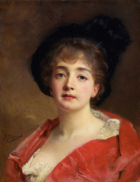 Konstantin Makovsky painted this oil on canvas portrait sometime in the late 19th century. The handling of the oil paint reveals much about the social status of both the artist and the sitter. Note the layering of thin glazes to create luminosity, especially in the sitter’s face and dress. This technique, common among academic painters, required both time and skill, reflecting the artist’s formal training and the value placed on refined craftsmanship. Also, consider the implicit labor of the sitter: the time spent posing, the care taken with her appearance, and the resources required to commission such a portrait all speak to her privileged position in society. The delicate brushstrokes and attention to detail in rendering her features and clothing further emphasize her status as a member of the elite. Ultimately, this portrait serves as a testament to the social dynamics of the era. It reminds us that even seemingly straightforward artworks are embedded with the processes of production and markers of class distinction.