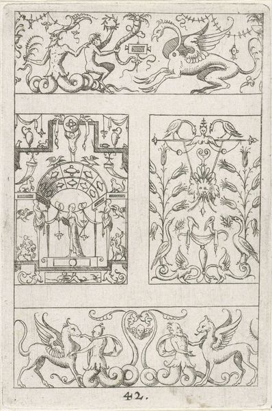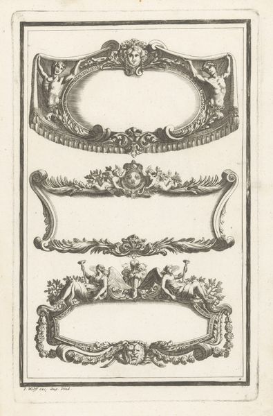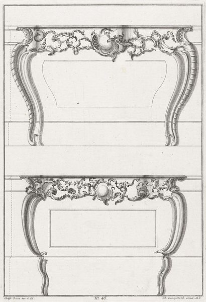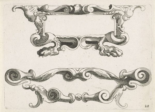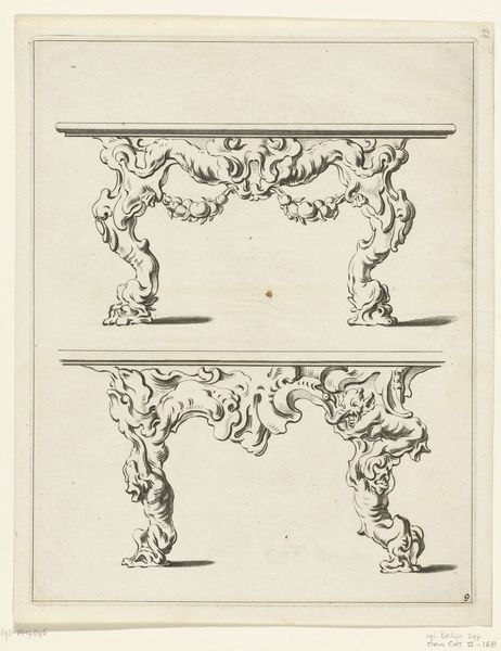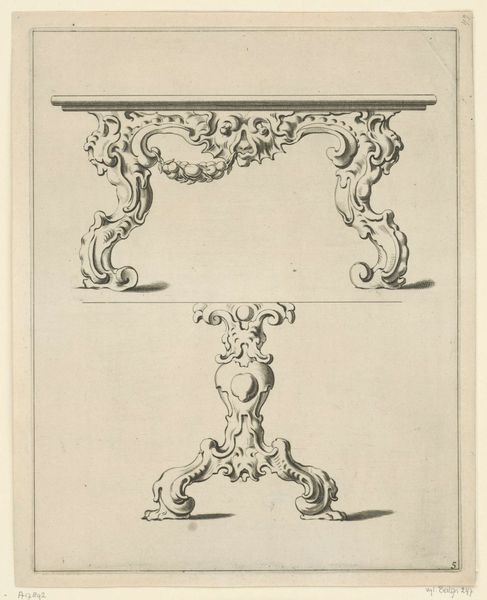 This drawing presents two table designs by an anonymous artist. Notice how the fine lines in the drawing and the intricate ornamentation give it a delicate feel. Each design features a rectangular frame supported by detailed sculptural elements. The upper design integrates fierce lion figures that act as both structural support and decorative motifs. The lower design incorporates putti, those chubby cherubic figures of Renaissance art, seated amidst military and theatrical objects. The artist employs asymmetry in the placement of the figures and ornaments, creating a lively and dynamic visual rhythm. The drawing reflects the era's fascination with symmetry and classical motifs. It challenges fixed meanings by combining elements from mythology and everyday life. The use of line, ornamentation and juxtaposition of images engages us in a visual discourse about perception, power, and the interplay of classical and contemporary themes.