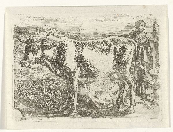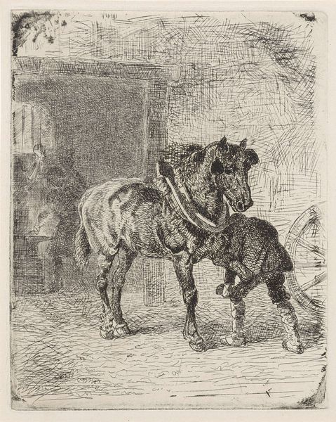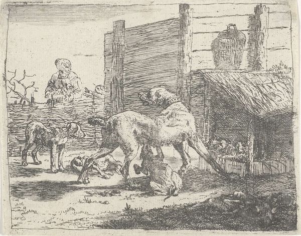 Jan van Ossenbeeck created this tiny etching, titled "Pakezel," sometime in the mid-17th century. Etching is an indirect process; the artist covers a metal plate with a waxy, acid-resistant ground, then scratches through it with a needle. When the plate is bathed in acid, the exposed metal is eaten away, creating recessed lines that hold ink. The fineness of the etching process allowed Ossenbeeck to achieve an astonishing level of detail, giving texture to the donkey's fur and suggesting the weight of its burden. The composition implies the economic realities of the time. The man and donkey were vital to transporting goods and connecting communities; their labor, captured through the careful strokes of the artist, serves as a reminder of the interconnectedness of humans, animals, and the land. Paying close attention to materials and the process, as seen here, allows us to fully appreciate the social significance of even the smallest of artworks.