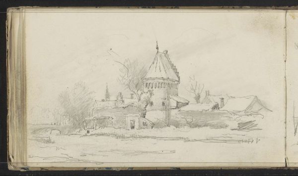Curator: Standing before us is a captivating pencil and colored pencil drawing by Johannes Tavenraat from 1844, titled "Kerk te Bedburg." It's a part of the Rijksmuseum's collection. Editor: It has a wistful air to it, doesn’t it? A memory sketched quickly in soft graphite with a hint of color; like something glimpsed out of a train window. Curator: Exactly! The piece is remarkable in how it balances precision with a kind of hazy, dreamlike quality. Observe how Tavenraat meticulously renders the architecture of the church – the layered steeple, the small gothic windows. Editor: Yes, but he’s not just copying, is he? There’s something subtly…off, architecturally. The viewpoint is intriguing; it feels like it’s not about exact representation, more about impressions of grandeur and place? A kind of psychological rendering? Curator: I would say this reflects a deliberate compositional choice, typical of the period’s interest in realism tempered with emotional resonance. The loose rendering of the foliage surrounding the building helps amplify the central form. The subdued palette, though minimal, lends depth. Editor: What intrigues me further are the sketches in the margins. What can we gather? Is that perhaps, a separate spire… an idea of Tavenraat to incorporate it differently? It’s all on paper – we can trace how an idea springs to life! Curator: Well, one could interpret this sketch as an emphasis of the overall linear elements, it shows Tavenraat’s initial ideas but also functions as the key symbolic anchor, reinforcing that connection between the temporal world and some form of transcendent presence. Editor: I feel a subtle spiritual depth there! Overall it gives a tangible sense of bygone eras where faith and community, for people, was inextricably entwined into the landscape! Curator: Indeed. This seemingly simple sketch contains entire worlds within it; reflections on faith, artistic process and memory – elements intertwined through Johannes Tavenraat’s careful hand and visionary gaze.