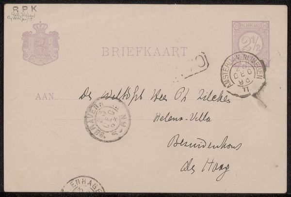 Curator: This is "Briefkaart aan Philip Zilcken," possibly from 1896, made by Cornelia van der Hart using pen and ink. The drawing itself is simple, but the lettering is what captures my attention. Editor: I see what you mean. I find the contrast of the elegant lettering with the more functional stamps fascinating. How do you approach this kind of work, considering it's "just" a postcard? Curator: I'm drawn to the materials and process of its creation, especially in understanding what constitutes "art." Here, the focus shifts from high art to the material reality: the pen, ink, paper, the postal system itself. It shows an intricate web of production and distribution. What do the stamps themselves tell you about its value and movement within a socio-economic structure? Editor: That's an interesting point! It’s not just about the visual aesthetic, but the systems it depended on, from postal services to the availability of materials. Curator: Exactly! Consider the labour involved—the manufacture of paper and ink, the postal worker’s journey, and of course, the artist’s time and skill. These are often unseen aspects of art consumption. We take for granted the accessibility of art and correspondence today, whereas the infrastructure implied here was central to artistic production. The postcard also operated as an advertisement of sorts when one looks at it as an artistic means to connect and perhaps create visibility. Editor: So it's almost a snapshot of the means of art communication and distribution during that time. I guess it shows me that it's so much more than "just a postcard." Curator: Precisely. And the context shapes the form, and the form contains that context. A useful lesson, wouldn't you say? Editor: Definitely! It encourages you to really dig into the nitty-gritty, I like that.