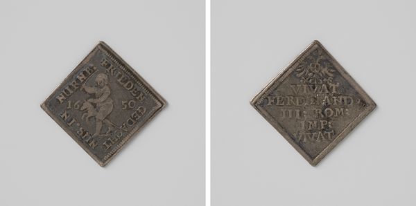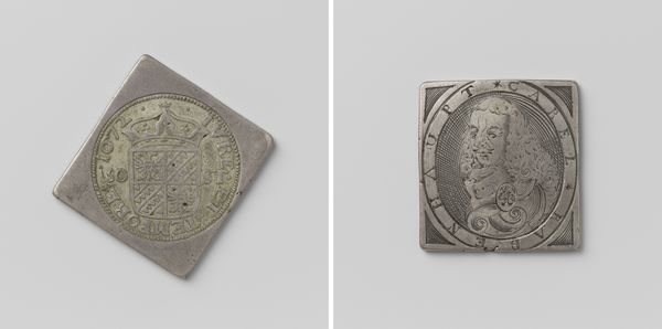 Editor: So this is a medal commemorating the Coronation of Frederik III of Denmark in 1648. It's anonymous and made of metal, possibly silver. The square shape is interesting... it kind of evokes a playing card or something. What do you make of this, knowing what you know about the art of that era? Curator: Well, let’s consider this object as a form of currency beyond its monetary value. Think about the labor involved in extracting and refining the metal, the crafting of the die, the striking of the medal itself. This isn't just about depicting power; it’s about the material assertion of power, isn't it? Who controlled access to the raw materials? Who possessed the technical skill to shape them? Editor: That's a good point. It represents a hierarchy of access. Was metal a standard for creating such medals at the time? Curator: Metal, especially silver or gold, was deliberately chosen. Think of its durability. The medal’s material inherently speaks of the perceived permanence and wealth of the monarchy. Engraving on metal also lends itself to mass production compared to sculpting marble. Editor: So, by choosing a material that lasts and can be easily replicated, Frederik is really ensuring his image will endure...almost like propaganda. Curator: Precisely! These medals weren't passively admired; they were circulated, exchanged, collected. The very act of owning or even handling it becomes a form of engagement with royal power. What is fascinating to consider is if commoners would have any access to these and in what quantity. How would that shape their perception of wealth or the royal family? Editor: This makes me realize how objects are rarely neutral. They are carriers of labor and power structures! Curator: Exactly. Every choice, from material to form, represents embedded cultural and economic values, which we must decipher.