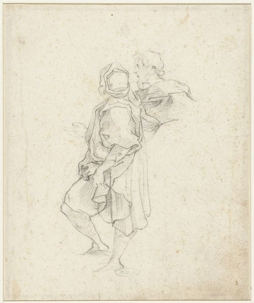 Curator: "Vrouw te Paard," or "Woman on Horseback," is a pencil sketch made circa 1656 by Gerard ter Borch, currently held at the Rijksmuseum. It strikes me as more of a fleeting impression, a notation of form rather than a polished piece. What are your immediate thoughts? Editor: It evokes a sense of lightness and ethereality. The light pencil work gives the impression of a dream, almost—a rider appearing and disappearing in a haze. But tell me, what do you see in the materiality of the piece itself? The very stuff it's made of? Curator: Well, its status as a pencil sketch offers some intriguing points about art production at the time. It probably served as an idea generation sketch, for ter Borch, perhaps preliminary studies for a more significant painting. This gives us insights into workshop practice and resource use of the 17th Century, beyond a single "finished" canvas. What do you see beyond just the material quality, however? What can we read from the iconography itself? Editor: The image of the woman on horseback has always resonated deeply throughout history. Think of depictions of power, victory, and even freedom. The upward movement of the horse speaks of aspiration, nobility. Given the period, might this resonate with concepts of female autonomy, however nascent? Or are there older symbolisms at work? Curator: It could certainly be argued, although with caution. A sketch like this could also be pure whimsy or personal fantasy rather than overt symbolism. Considering this might come from his personal sketchbook, its function becomes a lot more ambiguous. Did he use it for playful image invention or as a study? Editor: Indeed. But the power of such an image—a lone female rider—shouldn’t be easily dismissed, even in what seems a simple sketch. I still think it subtly challenges the traditional symbolic order through gender representation. Curator: An interesting perspective. Looking at it as a step in material art making, in practice in 17th Century Northern Europe versus how the finished images came about, shows two levels of image making. What do you think about the future effect and life of an image, viewed in different forms across long stretches of time? Editor: The symbolic power certainly lingers. While what ter Borch may have envisioned exactly at that moment remains unknown, these images gain momentum and acquire a unique agency of its own once they leave the artist's hands and enter the world.