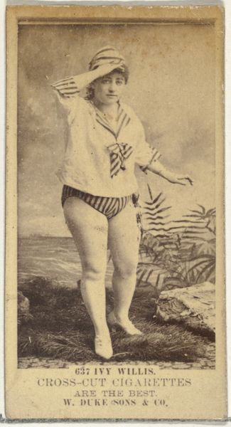 "Card Number 634, Miss Werner," was issued by W. Duke, Sons & Co. to promote Cross Cut Cigarettes. This card is a relic of the late 19th century, a time when advertising was rapidly evolving. The image of Miss Werner, an actress, dressed in what appears to be a stylized sailor outfit, offers a glimpse into the era's cultural norms. The hyper-feminized representation, intended to promote cigarettes, speaks volumes about the commodification of women's images. Her confident pose and alluring gaze hints at the complexities of female identity and performance of femininity at this time. The imagery may seem conventional, but it also suggests evolving representations of women in popular culture. Although seemingly simple, this card encapsulates the intersections of gender, commerce, and representation. It invites us to reflect on the historical construction of identity and the power of visual culture in shaping social perceptions, resonating with the ever present dynamics of today.