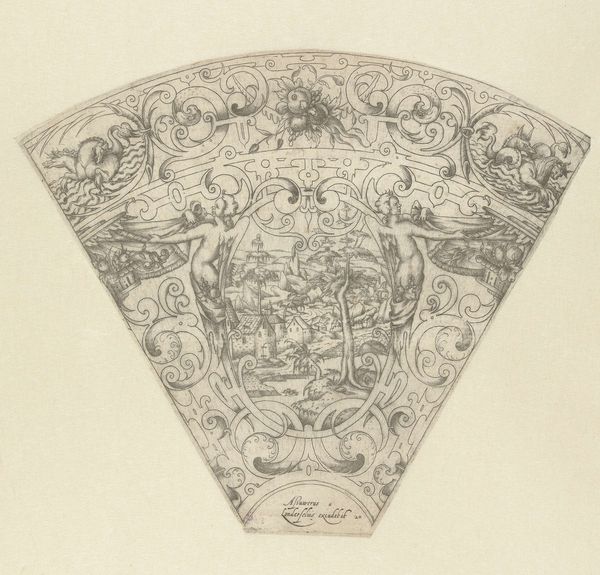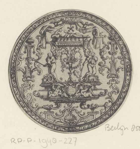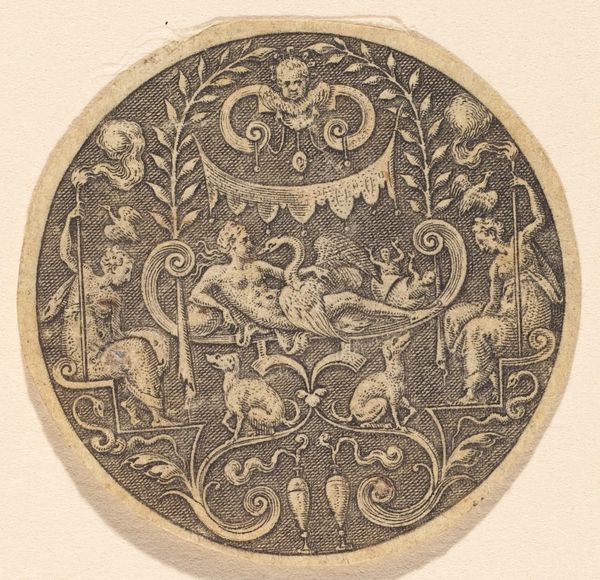 This is a small, round print by an anonymous artist, made using engraving – a technique that allows for fine, precise lines. The image shows a woman reclining with a cornucopia, surrounded by ornate decorations. The density of the lines creates a rich texture, almost like fabric. But it’s the process of engraving that really gives this image its character. Engraving involves cutting lines into a metal plate, filling them with ink, and then pressing the plate onto paper. It’s a labor-intensive process that requires skill and patience. This print probably wasn't considered "high art" at the time. Instead, it was more likely intended as a decorative element, perhaps for use in a larger design scheme. But by paying attention to the material and the making, we can appreciate the artistry and the cultural significance of this small but intricate work. It reminds us that even everyday objects can be imbued with beauty and meaning through the skill of the maker.
