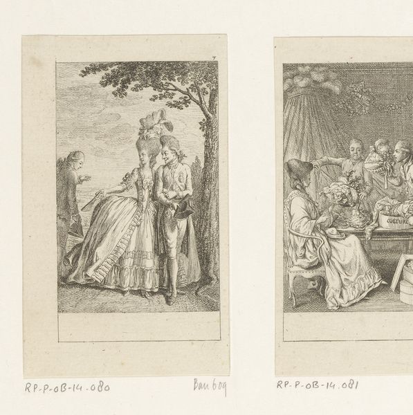 Editor: Here we have "Twee voorstellingen uit de verhalen van Wilhelm Gottlieb Becker" by Daniel Nikolaus Chodowiecki, dating to 1797. It combines etching and engraving on paper and feels like two acts in a play, rendered in meticulous detail. What is your read on this work? Curator: I see a reflection of late 18th-century social values and the burgeoning culture of sensibility. Chodowiecki, active during the Enlightenment, presents contrasting visions: private intimacy versus public spectacle. How does this dichotomy resonate within the historical context of the era? Editor: I see the contrast, the lovers on one side, then this…court or gathering…on the other, but is it a celebration, a condemnation… or something else? Curator: It's ambiguous, isn’t it? The 'public' scene can be interpreted as either a supportive or a critical audience. Considering the socio-political upheavals of the late 1700s, the piece invites us to question established hierarchies and the roles individuals play within them. Do you think the garden setting contributes to a sense of utopian escape? Editor: It feels separated. Maybe this romantic notion of escaping social constraint into a natural, simpler space? Like a pastoral fantasy versus courtly life...or maybe it’s simpler: two parts of one story, a ‘before’ and ‘after’ like panels in a comic? Curator: Exactly! The sequential narrative was becoming popular through illustrated books and pamphlets at the time. So, this engraving embodies emerging print culture that helped democratize visual stories for a wider audience. The choice of Becker's stories is not accidental; it speaks to the popular tastes and moral instruction sought during the period. Editor: That makes sense! Seeing it within that print-culture context brings a new appreciation. I’d previously only focused on the romantic mood of the scene. Curator: Precisely! It highlights the critical role museums and other institutions play in framing, disseminating, and preserving socio-political ideologies from various eras. Editor: I'm definitely looking at this differently now, less as a standalone artwork and more as a cultural artifact embedded in its time.