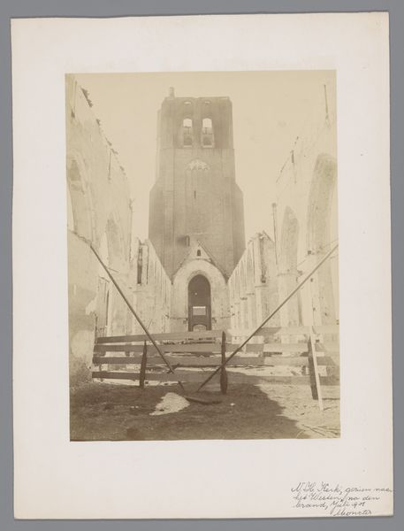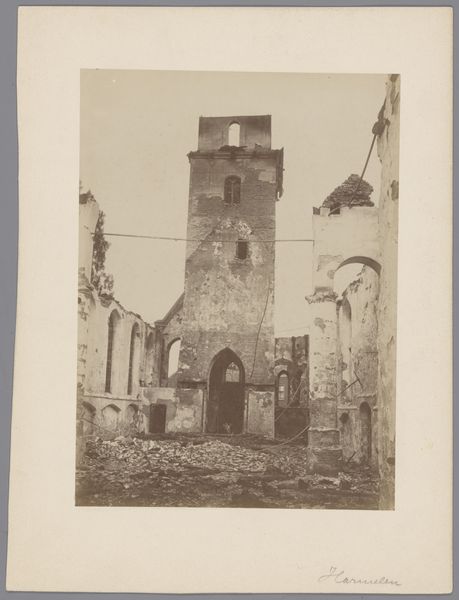 Curator: Looking at this intriguing photograph, titled "Interieur van de uitgebrande Hervormde Kerk te Haastrecht," it captures the interior of a burnt-out church around 1896-1900. Editor: Wow, it feels desolate, like a haunted stage set. You can almost smell the smoke. The stark light and those crumbling pillars, it's heavy, but also eerily beautiful, you know? Like a gothic novel cover. Curator: Absolutely. Think of the historical context – the role of the church, particularly a Reformed Church, within its community. A fire isn’t just a physical event; it's a socio-religious trauma, leaving its imprint on both the building and its congregation. The act of documenting it this way transforms it into a record of communal pain and resilience. Editor: So true, it’s not just stones, right? It's lives turned upside down. But the architecture itself! It has such presence still! I wonder, did the photographer intentionally highlight the arches against the devastation as a sign of lingering hope or stubbornness? Curator: Possibly! Photography in this period served purposes beyond mere record-keeping. It also offers silent testimony regarding ongoing debates of faith and the public role of architecture in the Netherlands, raising questions about civic order and spirituality amidst catastrophe. This image encourages the viewer to ask whether what remains has significance compared to what was. Editor: Well said. For me, there's an intimacy here. It's as if someone opened the church's rib cage, bare all. Makes you question the fragility of any structure—physical, spiritual, or societal, doesn't it? Curator: Exactly, the image opens multiple readings depending on where the audience is rooted, it is like witnessing history but through the soft lens of damage. A potent statement, even now. Editor: It certainly is...makes me wanna go make something both sad and beautiful now, thank you!
