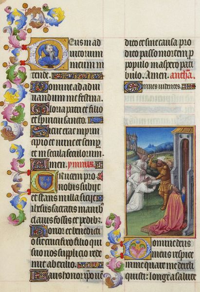 Editor: This illuminated manuscript page presents "Psalm XXVI," created by the Limbourg Brothers. It features both text and a vibrant miniature painting. The watercolor technique gives the image a soft, ethereal quality. I’m curious about how the artists integrated such different forms of media. What strikes you most about this work? Curator: Well, the materiality is really fascinating here. The labor involved in producing something like this—consider the preparation of vellum, the grinding of pigments, the meticulous hand-lettering and painting. Each element reveals a complex system of production. Editor: Production, interesting. It makes me think about the role of these illuminated manuscripts, as luxury objects, versus the actual religious content they portray. Curator: Exactly. These objects were meant to be viewed in very particular social contexts. Think about who would have commissioned such a piece, the resources they commanded, and what it symbolized. The gold leaf alone signifies not just wealth, but divine illumination. Editor: It is hard to imagine the sheer effort that went into this page. Considering the time invested and materials needed, this level of craftsmanship is truly remarkable. Curator: Absolutely. Examining the process helps us unpack not only artistic choices, but also the intricate relationships between labor, power, and spirituality in the late medieval world. Each careful stroke embodies a network of resources, skills, and beliefs. Editor: That really changes how I view the work. I was focused on the image itself, but understanding the production and materials tells a far more complete story.