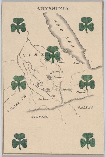 Editor: This is a print called "Interior of Africa, from 'Court Game of Geography,'" created sometime between 1838 and 1855 by William and Henry Rock. It looks like a rather rudimentary map. What do you see in this piece, beyond its obvious geographical subject? Curator: I see a fascinating example of how European powers constructed and disseminated knowledge about Africa. Notice the title itself, "Interior of Africa." It speaks volumes about European ambition to penetrate and map regions largely unknown to them, defining Africa on their terms. Editor: So it's more than just a simple educational tool? Curator: Precisely. The details included, like the labeling of "Soudan or Nigritia," highlight the specific areas that were of interest during the era of exploration and colonization. The inclusion of "Nigritia," literally 'land of the Blacks,' is deeply problematic. Editor: It's interesting how some of the names are recognizable and others not. Timbuktu is familiar, but not 'Taurick.' Were these maps widely distributed? Curator: Absolutely. “Court Game of Geography” suggests that the acquisition of such information became a form of entertainment for the educated classes, normalizing a sense of ownership and entitlement to this "knowledge" of Africa. The cute clover designs in the corners really contrast to the topic! It brings to light the dangers of how the ‘dark continent’ narrative was promoted at the time, shaping public perceptions and enabling exploitative practices. Editor: I had not thought of it that way; I was focused on it as a game! It definitely sheds light on how Africa was viewed, less as a collection of diverse societies and more as a resource to be charted and consumed by Europe. Thanks! Curator: And that's the power of looking at art through a historical lens! Seeing the public role of art, we've opened up a rich field of possibilities for further inquiry.