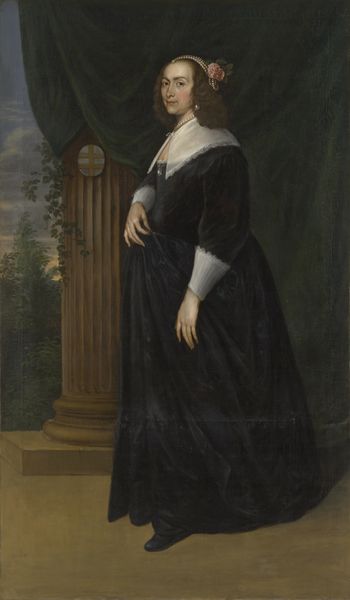 Vincenzo Camuccini painted this striking 184 x 135 cm portrait of Klementyna Ostrowska, née Sanguszko, using oil on canvas. The composition is immediately striking, dominated by the interplay of light and shadow which models the sitter's form. A restricted palette of dark blues, browns and gold is accented by the ochre curtain and architectural elements. The artist uses a classical structure, framing Klementyna within an elaborate setting reminiscent of ancient Roman interiors. The severe lines of the neoclassical architecture contrast with the softness of the fur stole and the subject's dress, creating a tension between the formal and the intimate. The painting can be examined through a semiotic lens, where each element functions as a signifier of status and intellect. Her clothing signifies sophistication and elegance, pointing towards an elevated social position. Observe how Camuccini destabilizes established meanings of portraiture by imbuing it with symbols of classical virtue and contemporary power. This elevates Klementyna beyond a mere depiction, situating her within a broader discourse of cultural identity and historical narrative.
