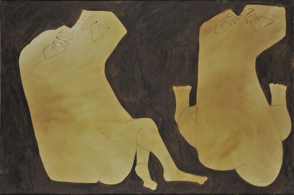 Nikos Nikolaou made this painting called 'Composition' at an unknown date, probably with oils. It’s got these two figure-like shapes floating in a brown space. The way Nikolaou uses paint is interesting; it’s like he’s carving out these forms with color. The bodies are painted with these smooth, buttery, honey colors, and the ground around them is this murky, dark brown. Look closely and you'll notice that the brown paint seems applied in swift, gestural brushstrokes, giving the background a sense of movement and texture. The hands, how they’re sketched, almost like they're holding their heads – it gives the whole thing a raw, kind of vulnerable feel. This reminds me of Guston. Not his later, cartoony stuff, but his earlier, more abstract paintings where shapes were always on the verge of becoming something else. Art's always about seeing what others have done and then messing with it, pushing it somewhere new, wouldn't you agree? Anyway, this piece invites you to think about what it means to see, to feel, and maybe even to question what you think you know about bodies and shapes.