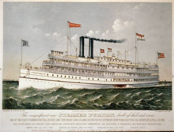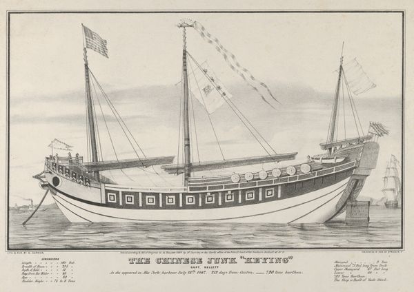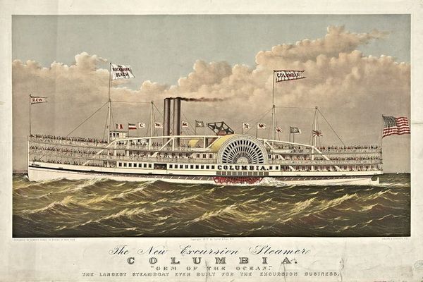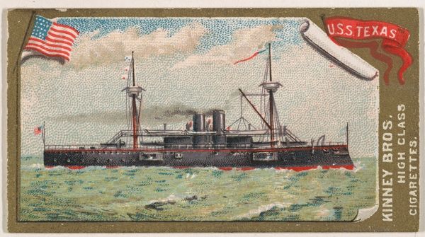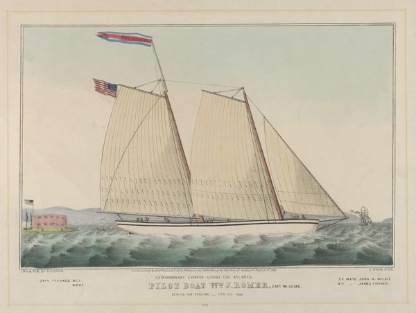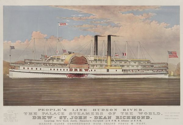 Curator: Here we have an 1883 watercolor print from Currier and Ives entitled, "Penobscot, New England coastal steamship". It depicts the steamer Penobscot cutting its way through some pretty dramatic waves. What strikes you initially? Editor: That enormous paddle wheel, for starters! It dominates the scene, an intricate and almost delicate mechanism powering this beast of a steamship. There's a fascinating tension between the industrial and the picturesque at play here, don’t you think? The billowing smoke, too. You can almost smell the coal burning. Curator: Precisely. Currier and Ives were masters at romanticizing industry and westward expansion. While trained as fine artists they moved into a more lucrative space, bringing art to a broader middle class audience. They transformed these symbols of industrial might into something almost aspirational, imbued with a sense of adventure and progress, selling the dream more than the grit, let's say. Editor: Well, looking closely at those waves, one can tell this isn't simply a neutral record of maritime transportation. There’s certainly artistry there. The swells feel quite exaggerated, contributing to a real sense of motion and perhaps even peril. Consider also the material context, printmaking democratizing images to an audience keen to celebrate progress, making industry consumable at a domestic scale. Who made this print exactly, do we know? Curator: The names "Currier and Ives" signify a collaborative brand more than the hands of particular artists in this era. Though many different artists were employed to make artworks under these names, the focus was very much on consistency and ease of mass production, prioritizing market demands over specific artistic voices. Editor: A very good point. And in their time, I'm sure their works served as functional decorations, inexpensive glimpses into a larger world for a nation undergoing immense change. It seems so removed from how we understand or engage with such prints now. It asks us what we do with industry today in this digital production world. Curator: It does, indeed. It highlights that fascinating tension between the machine-made and the handcrafted. It allows us to appreciate how art continually redefines its relationship to production. I've rather changed my thinking about this piece... Editor: Me too. I began purely captivated by this maritime titan, but it becomes increasingly unsettling to view the painting just as it is, especially when understanding how many individual processes it took to get here.
