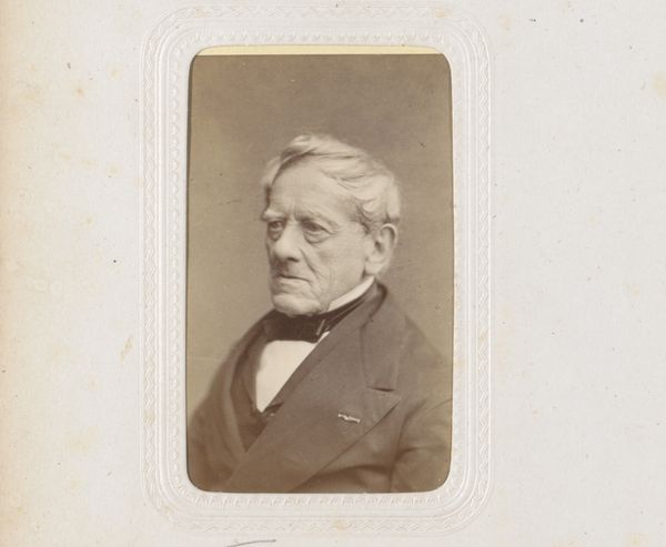 Curator: An arresting portrait—almost austere. There’s a palpable weight to the sitter’s gaze, a certain world-weariness, wouldn’t you say? Editor: Absolutely. It speaks volumes even before one delves into its history. The very soft sepia tones create a sense of intimacy, and perhaps…melancholy? It’s almost like viewing a faded memory. But let's orient our listeners to the artwork itself: this is "Portret van een oude man" by Charles Binger, created between 1872 and 1887. It's a photographic portrait, residing here at the Rijksmuseum. Curator: Binger captures something archetypal, I think. He's using the relatively new medium of photography in a very conventional portrait style – an oval frame suggesting paintings from previous centuries, and creating an instant ancestral feel, almost imposing the weight of inherited history onto the individual. This speaks to photography's immediate societal function; an emerging form to memorialize. Editor: Exactly. The pose and the formal wear immediately project status and respectability. I am drawn to the framing of the man within the photograph as much as the subject itself; both serve to monumentalize this subject's social standing during the Victorian era. He's contained, presented for our analysis – for public consumption, if you will. Curator: But look closer. There’s also a certain fragility, a sense of vulnerability behind the confident posture. Look at the light etching the lines in his face – each one seems significant, laden with experience. It creates a sense of empathy with him – regardless of how he wishes to be perceived. Photography also captures nuance that paintings may unintentionally obscure. Editor: A compelling tension. Perhaps Binger intended to subvert those very expectations that formal portraiture generated; by capturing the humanity of the individual beneath societal expectations and the symbolic weight of his older years, he creates a photograph of a very real human with emotional complexity that may not otherwise be socially permissible in art or society. Curator: In a society still grappling with rapid industrialization, such formal portraits likely served as visual anchors of tradition. Perhaps offering a semblance of stability, projecting an image of enduring values— family, responsibility, legacy... things we see encapsulated in his resolute stare. The symbolic weight is carried visually on this man. Editor: It all adds up to such a complex narrative for what initially appears as a straightforward photograph! We can discuss how photography influences cultural perceptions of individuals, society, and art more broadly for some time to come.