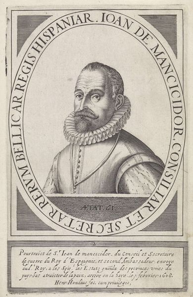 Curator: This portrait of Joh. Huijssen van Cattendijcke, created between 1583 and 1650 by Hendrick Hondius I, is an engraving, a print. I find the subject’s clothing intriguing. The patterns and textures must have been laborious to carve. Editor: Yes, that is certainly striking! What strikes me most is the man's serious expression amidst such ornate details, almost austere in a way. What do you make of this artwork, beyond the man portrayed? Curator: I see a sophisticated piece of propaganda. The lines etched into the copper plate weren’t just aesthetic; they represented labour, time, and expense, demonstrating Hondius’ skill and, crucially, Huijssen van Cattendijcke’s status and access to such craftsmanship. Editor: Propaganda, you say? How so? It seems simply to document the sitter. Curator: Well, consider the context. Prints like this were reproducible. What was normally available solely to the upper class became a commodity available on a scale before unseen. This isn’t just about capturing a likeness; it's about projecting power, using the materials and means of production to construct an image of authority. Who commissioned the portrait? Editor: The inscription mentions Huijssen was an admirer and patron of engraving... perhaps it was a collaboration? A self-aware act of image-making? Curator: Precisely! Hondius wouldn’t have had this level of success if there wasn’t an audience for his skills in the bourgeoning art market of the Dutch Republic. They fed off each other. And he would never have enjoyed the benefits from art commerce had patrons not sought out this production and artistic skill! Editor: I had not considered the print’s social impact or its impact on consumerism at the time. I can see how analysing material processes can uncover unexpected angles. Curator: Indeed! Understanding art means also understanding its production and what those processes communicate!