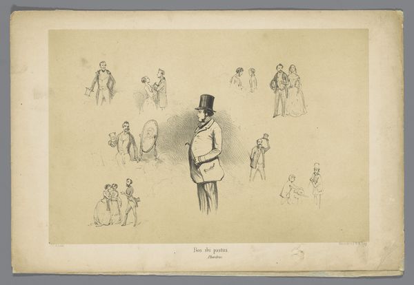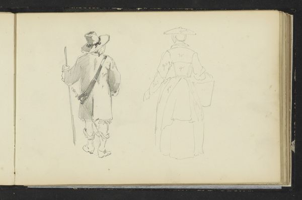 Editor: This drawing, "Figuren in zeventiende-eeuwse kleding," by Cornelis Springer, dates to around 1882. It's rendered in graphite on paper. It has this quiet, almost ghostly quality due to the soft pencil strokes. What stands out to you in terms of its composition and technique? Curator: The reduction to line is quite compelling here, wouldn't you agree? Consider the ways Springer has used subtle gradations of tone through hatching and cross-hatching to delineate form and create spatial depth. Notice how he directs our eye through the strategic placement of these figures. Editor: Yes, the figure in the foreground certainly anchors the piece. But, it feels less about individual expression, and more about the rendering of historical garments and forms. Would you agree? Curator: Precisely. The intrinsic interest lies not in emotive display or psychological probing, but in the almost scientific rendering of form and texture through graphite. Consider the way light plays across the folds of fabric, achieved with such minimal means. It reveals much about his mastery of technique, doesn't it? Editor: I see what you mean. It's like a study in textures and shapes, divorced from deeper meaning. Thanks for pointing that out. Curator: The very limitations of the medium, I'd say, give rise to its expressive potential in this case. Thank you. I noticed more on this pass, as well.