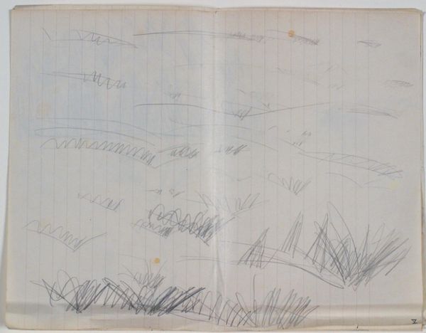 Editor: We’re looking at Niels Larsen Stevns’ "Landskabsstudie. Notater og farveangivelser," a landscape study from the 1930s done with pencil on paper. It feels incredibly ephemeral, just these faint suggestions of a scene. What catches your eye? How do you interpret this work? Curator: This work functions almost like a coded map, wouldn't you agree? We see landscape distilled down to its most fundamental elements – line, horizon, perhaps a suggestion of foliage. But interspersed, literally woven into the depiction, are notes. Notice the phrase "blomsterne lomst til venstre"—"flowers bloom to the left." This imbues the image with a layered symbolic language. The artist is not simply representing a landscape; he's recording a sensory experience and its emotional resonance. He seeks to understand the symbolism inherent to our perception. Editor: So, the landscape itself becomes a carrier of memory, enhanced with his written observations? Curator: Precisely. Think of how cultures have historically encoded meaning onto the natural world: sacred groves, rivers as boundaries between worlds. Stevns appears to be engaging in a similar process, though on a more intimate, personal level. Are the notes more important than the landscape, or are they codependent? Editor: It makes me think about how we each create our own landscapes in our minds, colored by individual memories and associations. Thanks! Curator: Indeed. And how visual shorthand, almost a symbolic writing of the land, can hold profound cultural and personal significance.