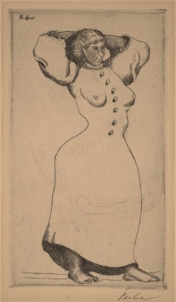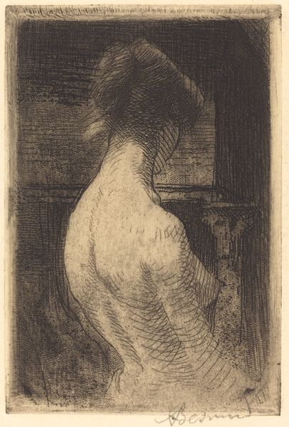Editor: This is Willem Adrianus Grondhout's 1933 etching, "Zittende, naakte vrouw," or "Seated, Nude Woman" here at the Rijksmuseum. It's a small, intimate piece, and the stark lines create a feeling of vulnerability. What strikes you about this work? Curator: Considering the date, 1933, this etching participates in a long history of representing the female nude, yet does so within the socio-political climate of the interwar period. Etchings, as a more accessible medium than painting, also had a wider circulation, democratizing the consumption of such imagery. Does this perhaps normalize such images or bring art to different publics? Editor: That's a really interesting point. So, in the context of mass media, how does it fit into discussions around female representation in art? Curator: Precisely. Consider how the 'male gaze,' as articulated by Laura Mulvey, traditionally frames the female nude. The woman is the object of the artist’s, and often the viewer’s, desire. Is Grondhout’s approach complicit in this? Or are there subtle choices - her gaze, the informality of the pose, the seeming lack of idealization - that subvert expectations? Editor: It does feel less about idealization, and more like a glimpse into a private moment. Almost documentary-like. Curator: Exactly. Think about how institutions, like the Rijksmuseum here, have historically acquired and displayed these images. What message does that convey about the acceptability or value of the subject matter? Do the figures of power and institutions add legitimacy? Editor: Wow, I never thought about it like that, almost as an endorsement. So, it seems the art's history continues even after the artist is done with it! Curator: Indeed. How an artwork functions as a cultural artifact can be influenced by curators, galleries, publications, and institutions like the museum itself. We, in essence, control the legacy through our collection and exhibition choices. Editor: I’ll definitely view art in museums differently now, understanding the layers of interpretation and history. Thanks so much! Curator: It was my pleasure! Examining these power dynamics within the art world is always rewarding and necessary.