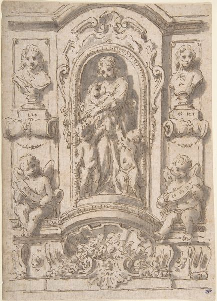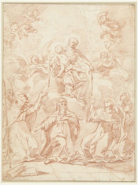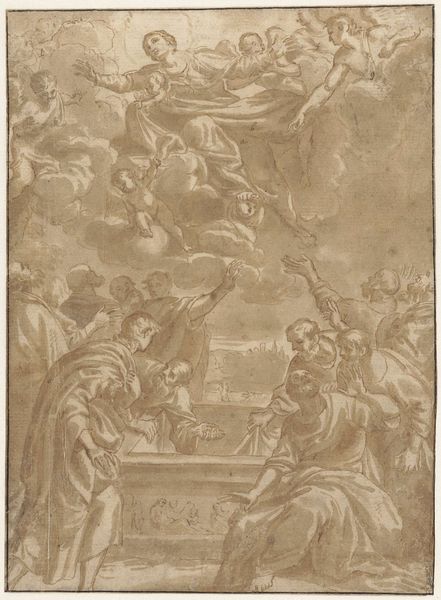 This drawing, "The Virgin Appearing to St. Bernard of Clairvaux," was made by Niccolò Ricciolini using pen and brown ink with brown wash over black chalk. The composition presents a dramatic vision through the interplay of light and shadow, with the Virgin Mary elevated amidst a celestial gathering. Ricciolini uses the grid markings to structure the visual space, creating a formal framework that contrasts with the ethereal subject matter. We are presented with the structure and semiotics of religious representation. Note how the upward gaze of St. Bernard and the dynamic gestures of the surrounding cherubs are not just aesthetic choices but function as signs within a larger cultural discourse. Ricciolini challenges conventional interpretations of the divine through form rather than narrative detail. This piece is not only a depiction of a religious event, but also an exploration of space and form, inviting ongoing dialogue.