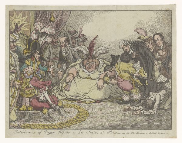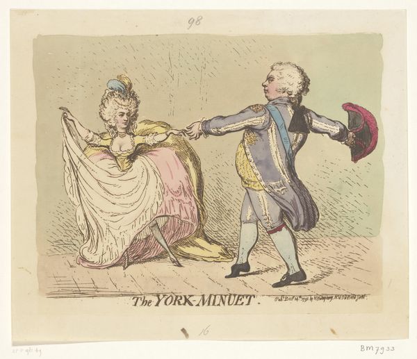 Editor: Here we see George Montard Woodward's "Scene at a Ball." It's a watercolor, and the figures are just wonderfully animated and grotesque. What strikes you about the means of production here? Curator: Woodward's print points directly to the commodification of leisure. Notice the rapid, almost slapdash application of color. This speaks to the speed of production needed to meet the demands of a growing middle class eager for satirical depictions of social life. Editor: So, it’s not just about what’s depicted, but how quickly it could be made and distributed? Curator: Exactly! The etching process allowed for mass production, making social commentary accessible and contributing to a culture of consumption. Editor: I hadn't considered that the artistic *process* itself was part of the commentary. Thanks for making that connection! Curator: It's crucial to remember that art doesn't exist in a vacuum. The materials and methods of creation are often as important as the subject matter.