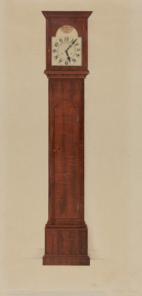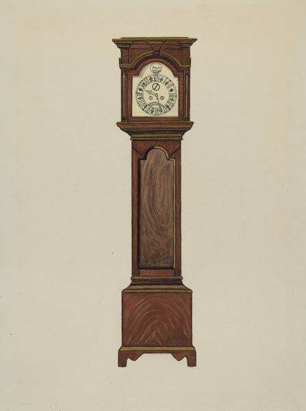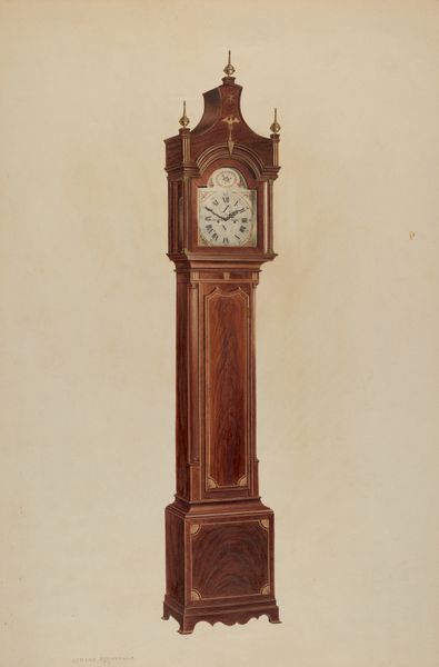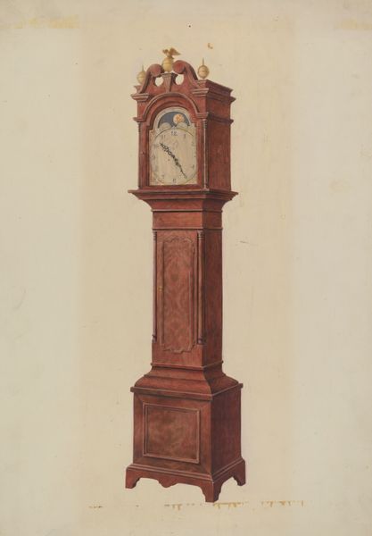 Curator: This is a tall clock, created by Henry Hill sometime between 1730 and 1750. It's an extraordinary piece of Baroque decorative art, carved from wood. Editor: It has this intense feeling of… looming! I immediately think of the rigid social structures of the 18th century. Something about its height and stern face makes me uneasy. Curator: Uneasy? Well, think of it as more than just a time-telling device. It was a status symbol! Placed prominently in a wealthy home to showcase precision and order, very performative. Editor: Exactly! All about controlling time, labor, and bodies. And the fact that it’s so phallic, like a looming patriarchal figure presiding over the domestic space… it feels deliberate. The carving becomes another layer of that controlled presentation. Curator: Ha! I suppose one could see it that way. I always just saw the craftsmanship. Think about the carving, the patience! It’s exquisite detail is more about pride of work and artistry. A way to bring beauty into the everyday. Editor: Perhaps. But can we separate beauty from the power structures it served? This wasn’t just about individual artistry; it was about reinforcing hierarchies. Even its physical placement in the house… who got to be near it? Whose time was being dictated? Curator: Okay, okay, point taken! But, still, can't we appreciate its artistry independent of all that? It's like saying we can't enjoy a landscape painting because it once belonged to a colonizer! I mean...where does it stop? Editor: I think it's about holding both truths: acknowledging the skill while also understanding the social context. Not necessarily negating the aesthetic value but enriching our understanding of its impact. Curator: Right, like… remembering who made it possible, I suppose. Otherwise, it’s just… nice wood. Well, thanks for making me feel bad about admiring old clocks! Editor: And thank you for reminding me that beauty can be a powerful and complicated thing. This object is less silent now, with a broader narrative for those who listen.